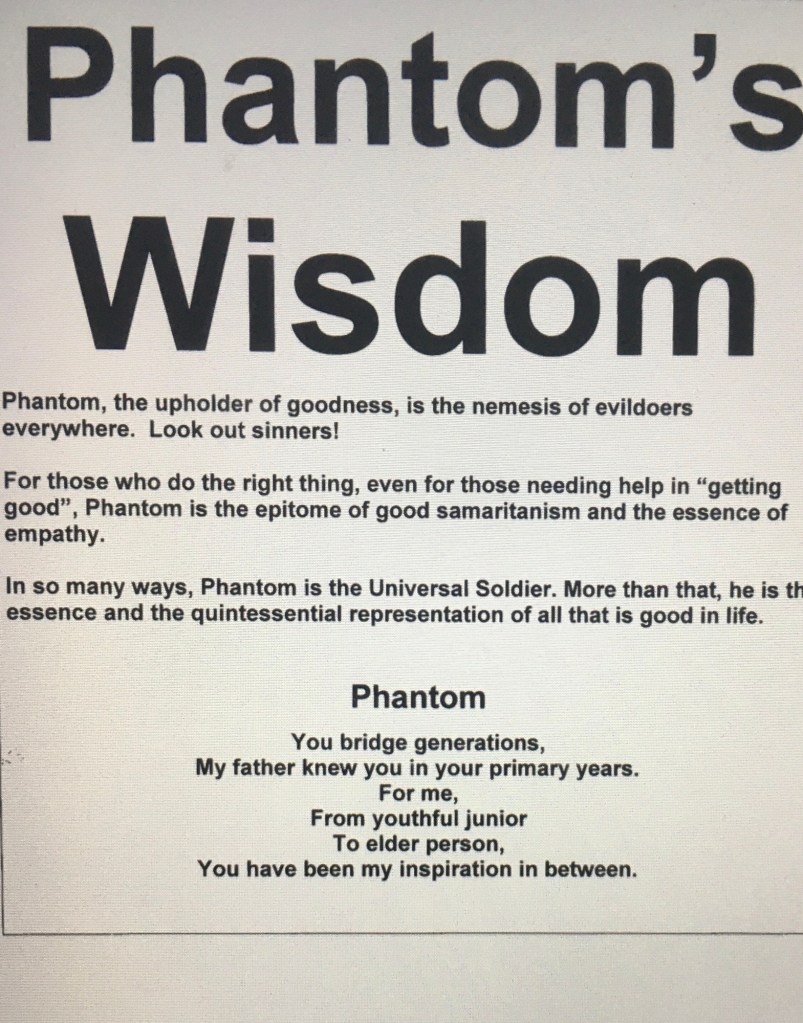 THE WISDOM OF OF THE PHANTOM HAS ENDURED FOR MY WHOLE LIFE Posted on February 9, 2024 by pooroldhenry Share this: Share on X (Opens in new window) X Share on Facebook (Opens in new window) Facebook Like Loading...