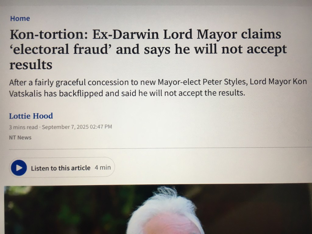 High drama in Darwin’s Lord Mayor contest Posted on September 7, 2025 by pooroldhenry Where to from here? Share this: Click to share on X (Opens in new window) X Click to share on Facebook (Opens in new window) Facebook Like Loading...