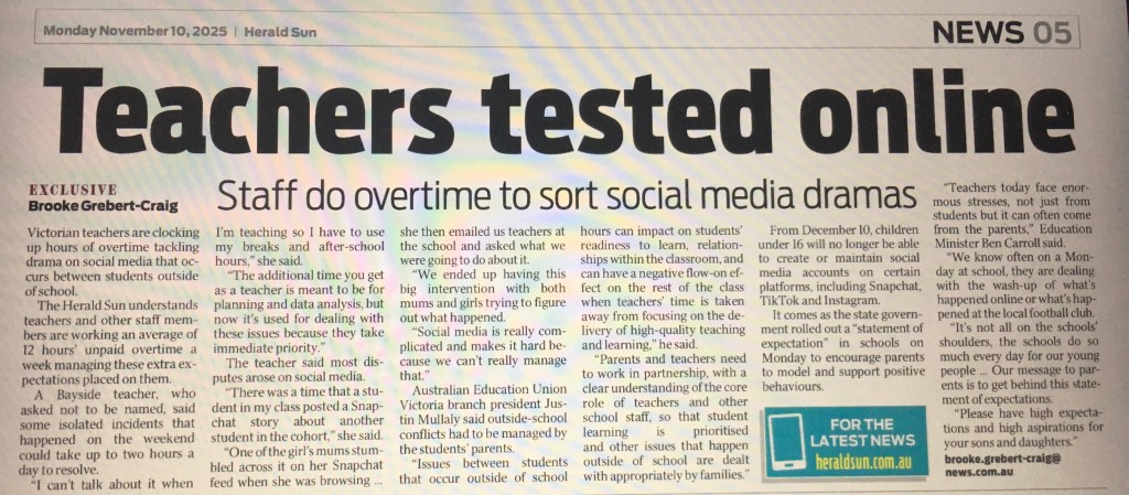 Teachers buffeted left, right and centre – 24/7 Posted on November 13, 2025 by pooroldhenry Years ago I counselled against this to my staff. Caution in communication is so important. Share this: Click to share on X (Opens in new window) X Click to share on Facebook (Opens in new window) Facebook Like Loading...