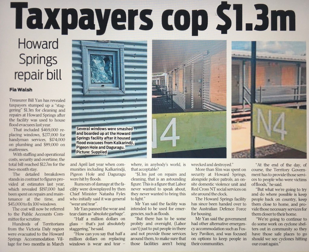 Hats off to Chief Minister Lawler for her no-nonsense and common-sense approach to refitting the present Don Dale Centre (old Berrimah Jail) to accommodate the low-level risk prisoners. With some refurbishment, the place is more than fit for this purpose. The growth of our prison population makes this change (to knocking the place down) necessary.